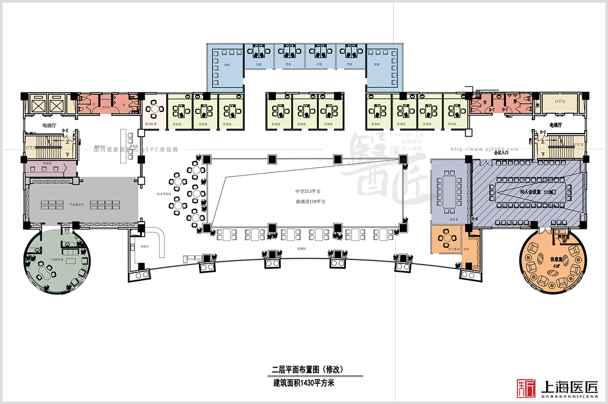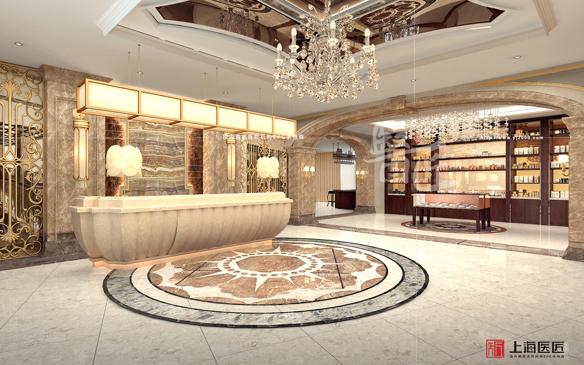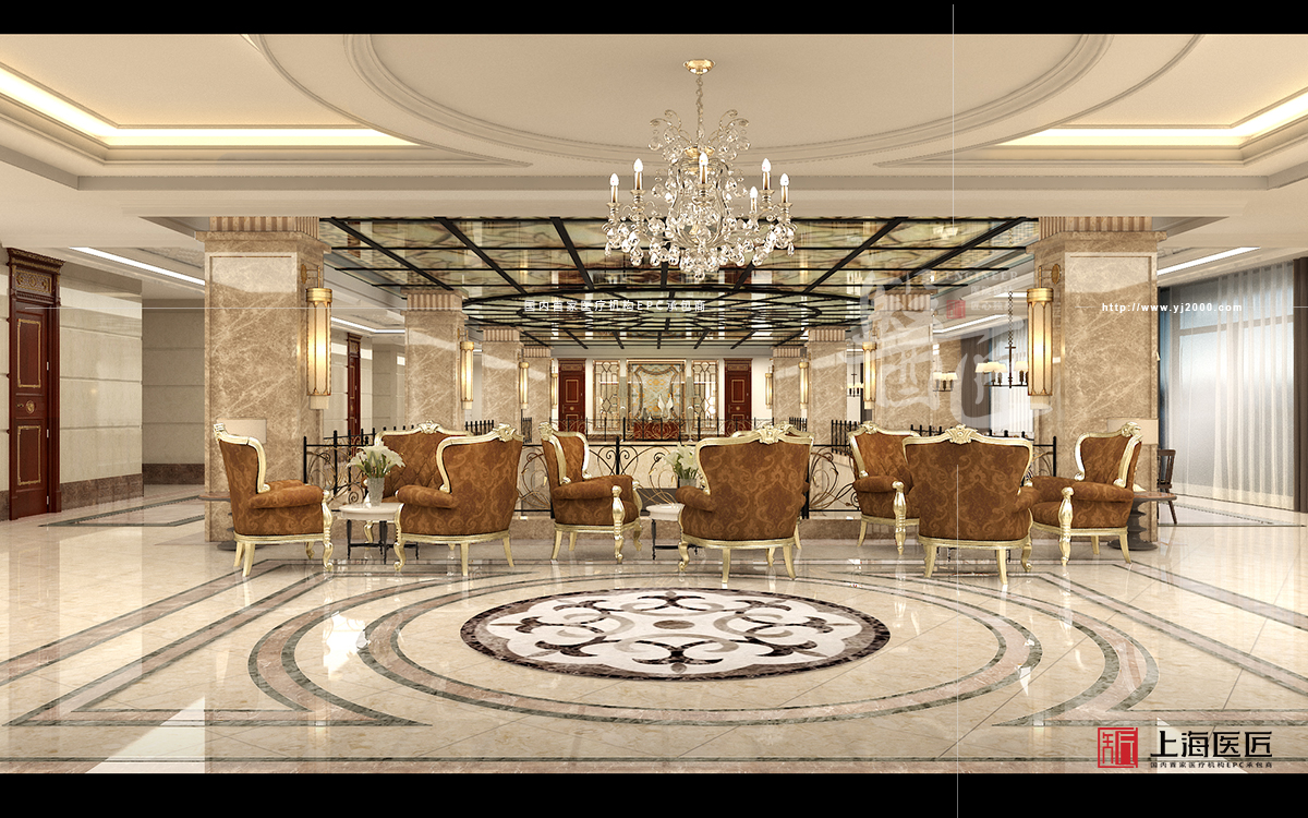 本案以新古典为设计风格,整体环境高雅而和谐,在色调上,选用前浅金、银灰为主调,共享空间用家具、吊灯等装饰来烘托高贵、典雅且不失浪漫的氛围,营造一个温情复古、高雅庄重的环境,不仅满足了现代女性的生理心理,同时也呼应医院提出的人性化感动式服务。