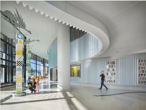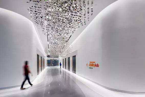 位于美国芝加哥的雪莉瑞安行为研究中心是一个转化研究机构,为患有创伤性脑损伤、中风、截肢和癌症的患者提供复杂的康复治疗。该项目室内设计注入大胆的色彩和图形,在整个空间中注入能量。在候诊大厅欢迎患者的是艺术家佩·怀特的设计的“密史脱拉风”吊顶(抛光不锈钢材质),它象征性地加强了运动、转变、可能性和希望的力量。